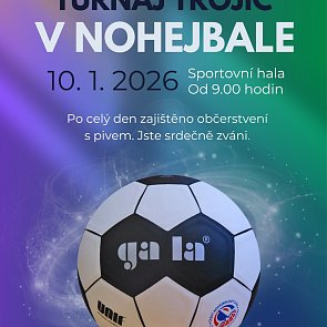 V sobotu 10.1.2026 Nohejbalový oddíl Horní Planá vás zve na turnaj trojic v NOHEJBALE ve sportovní hale od 9:00 hod. Po celý den zajištěno občerstvení s pivem.